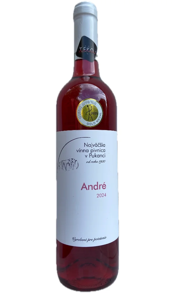 André ročník 2024, odrodové ružové víno, polosladké, bez zemepisného označenia. Toto víno sa predstavuje sýtou, žiarivou ružovou farbou, ktorá v pohári pôsobí sviežo a lákavo. Vzniklo rýchlym lisovaním hrozna odrody André, čím si zachovalo svoju jemnú ovocnosť a sviežosť. Vôňa je intenzívna a hravá – dominujú jej tóny čerstvého záhradného ovocia, ako sú maliny, jahody a červené ríbezle, ktoré pozývajú k prvému dúšku. Chuť je šťavnatá, s príjemnou polosladkou harmóniou, ktorá podčiarkuje ovocný charakter vína. Záver je hladký, s jemným smotanovým dotykom, ktorý dodáva vínu zamatovú eleganciu a dlhú dochuť. André z tohto ročníka je ideálnym spoločníkom k ovocným dezertom, jemným syrom, ľahkým šalátom či ako osviežujúci pohár na letné posedenie.