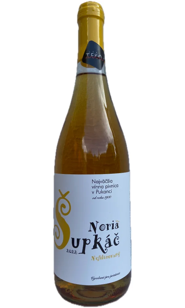 Noria – macerácia na šupkách, ročník 2022, odrodové biele víno, suché, bez zemepisného označenia. Toto víno zaujme už na prvý pohľad svojou výraznou oranžovo‑žltou farbou, ktorá je výsledkom tradičnej techniky kvasenia a ležania na šupkách. Tento postup, typický pre tzv. „oranžové vína“, mu dodáva nielen nezameniteľný vzhľad, ale aj bohatú štruktúru a komplexnosť. Vôňa je intenzívna a charakteristická – spája svieže grepové tóny s jemne herbálnymi nuansami, ktoré sú umocnené prítomnosťou šupiek a semienok počas kvasenia. Na podnebí sa rozvíja šťavnatá, plná chuť, v ktorej sa ovocná sviežosť prelína s pikantným tanínom v závere, čo vínu dodáva osobitý charakter a dlhú dochuť. Víno je nefiltrované, čo zachováva jeho prirodzenú hĺbku a autentickosť. Noria z tohto ročníka je ideálnym spoločníkom k výraznejším syrom, grilovanej zelenine, jedlám z diviny či orientálnej kuchyni, no zaujme aj samostatne pri pomalom vychutnávaní.
